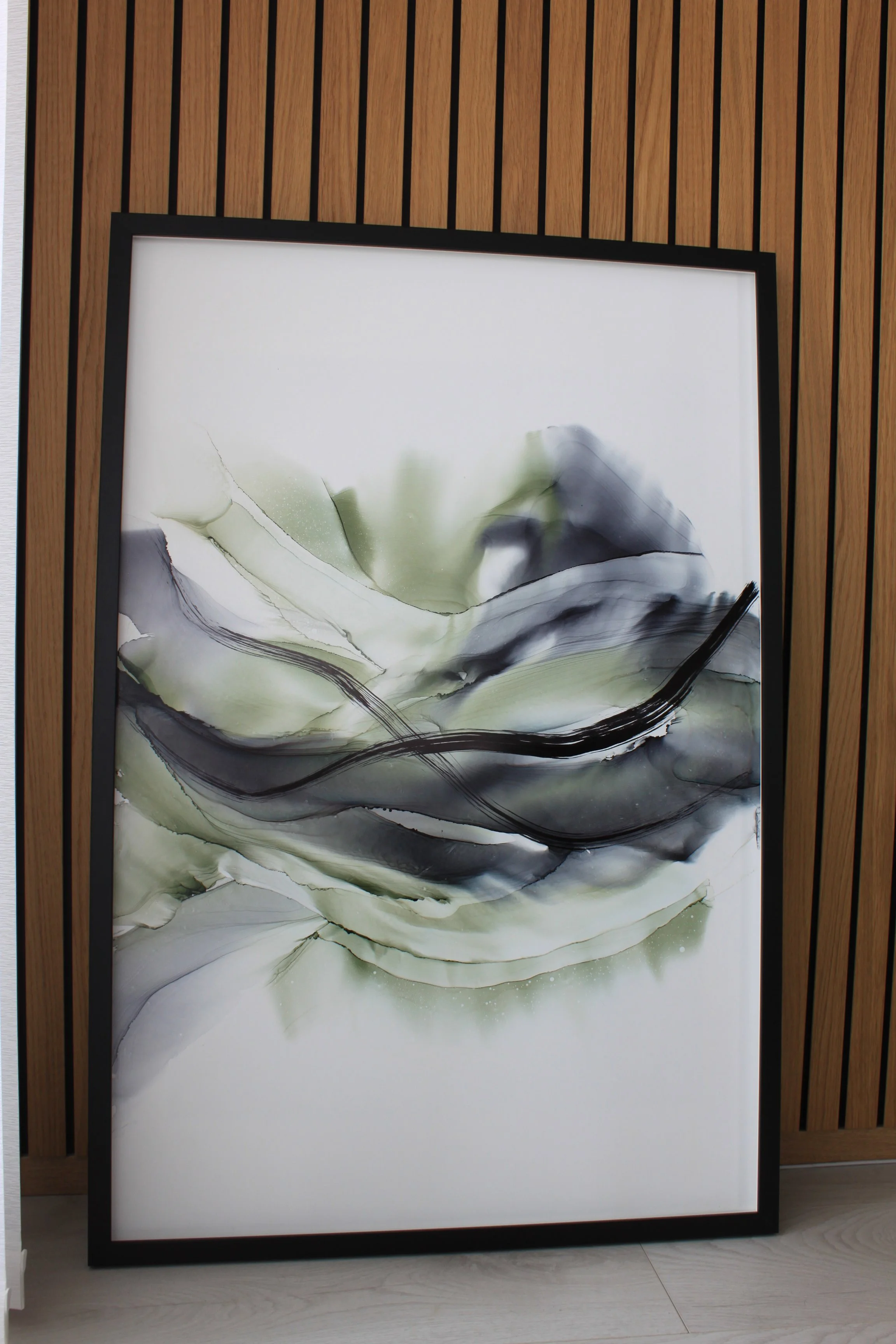 Alkoholimustemaalaus synteettiselle paperille. Teos on suojattu lakalla ja UV-suojalla.