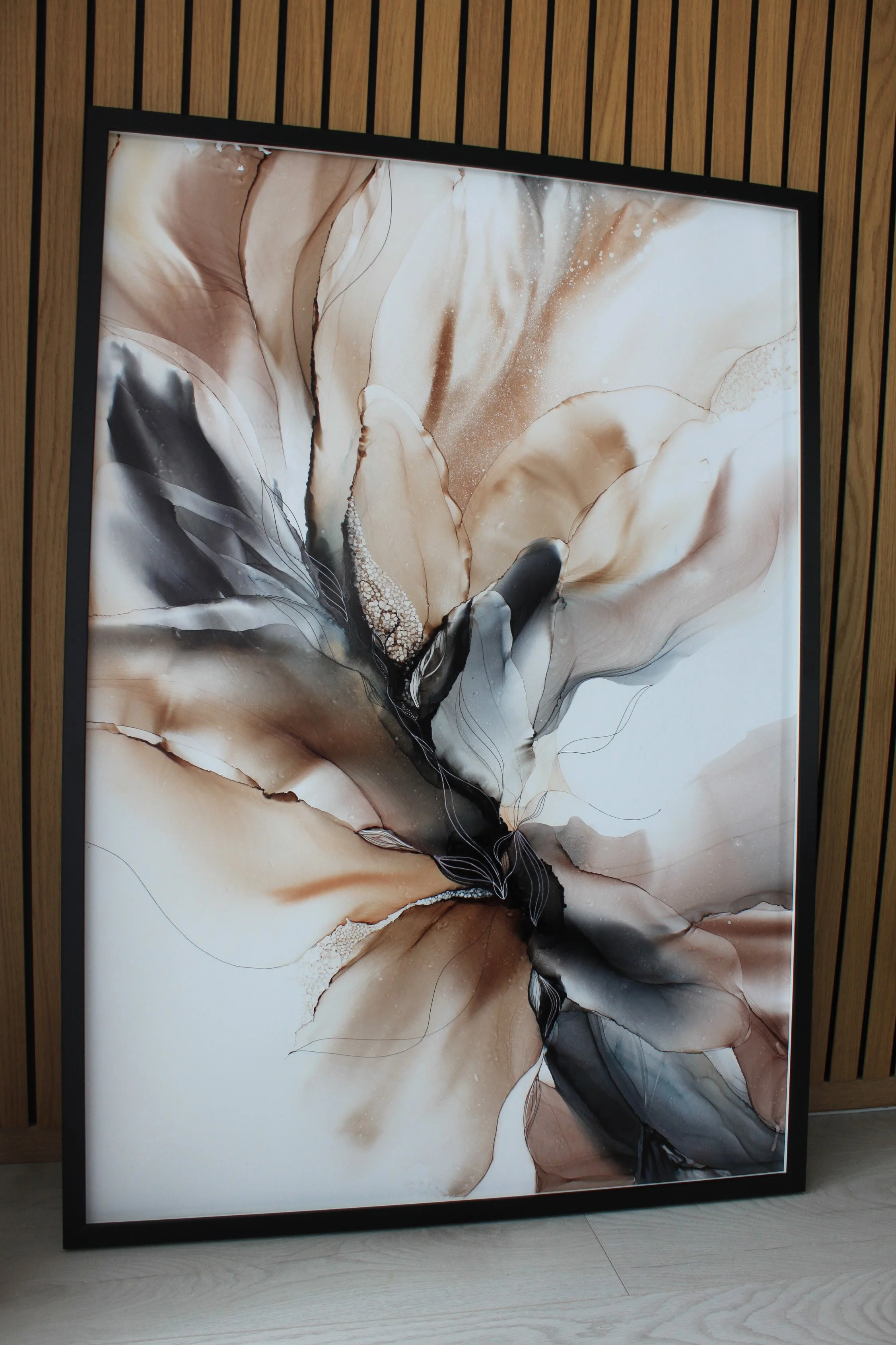 Alkoholimustemaalaus synteettiselle paperille. Teos on suojattu lakalla ja UV-suojalla.
